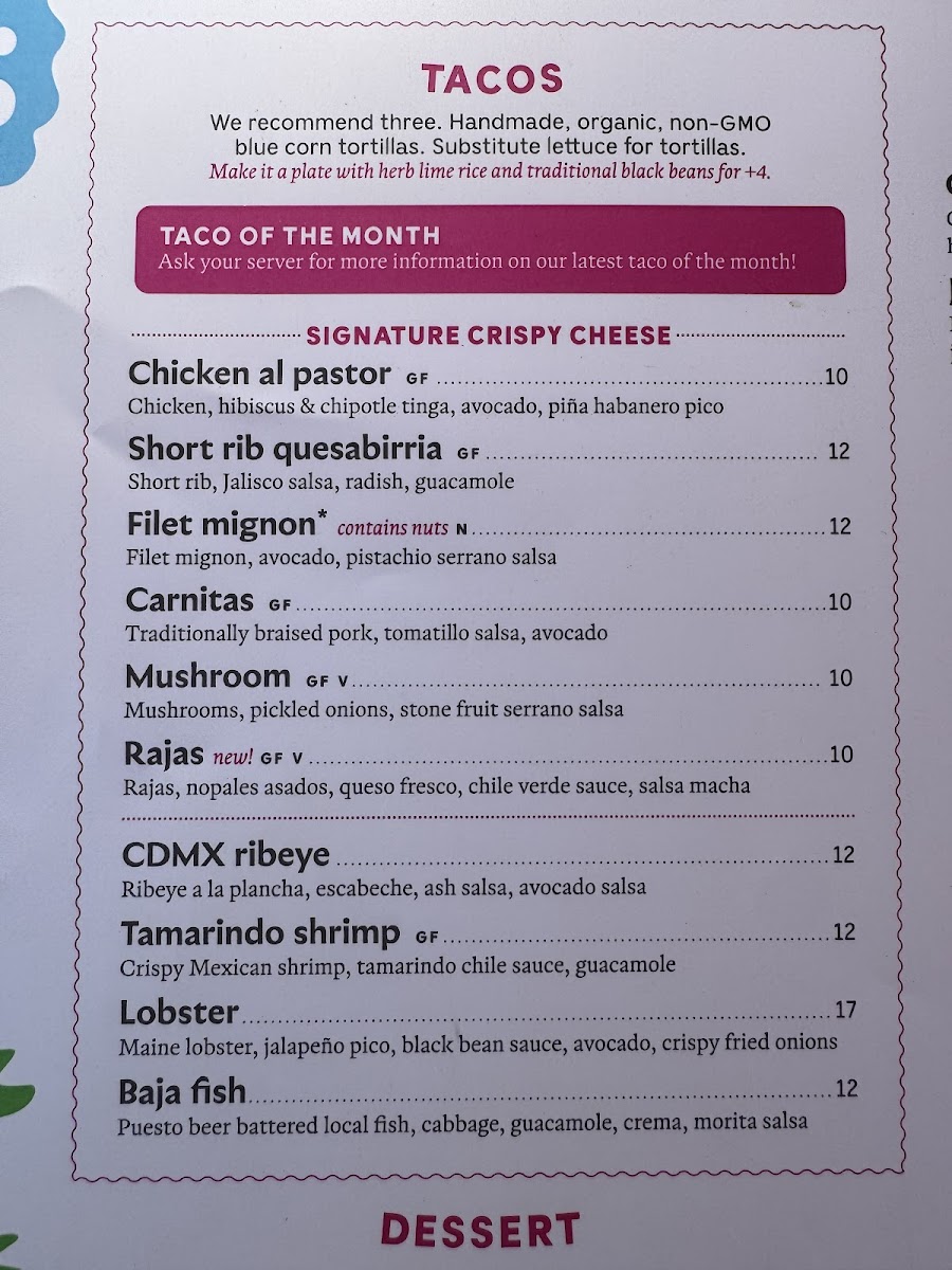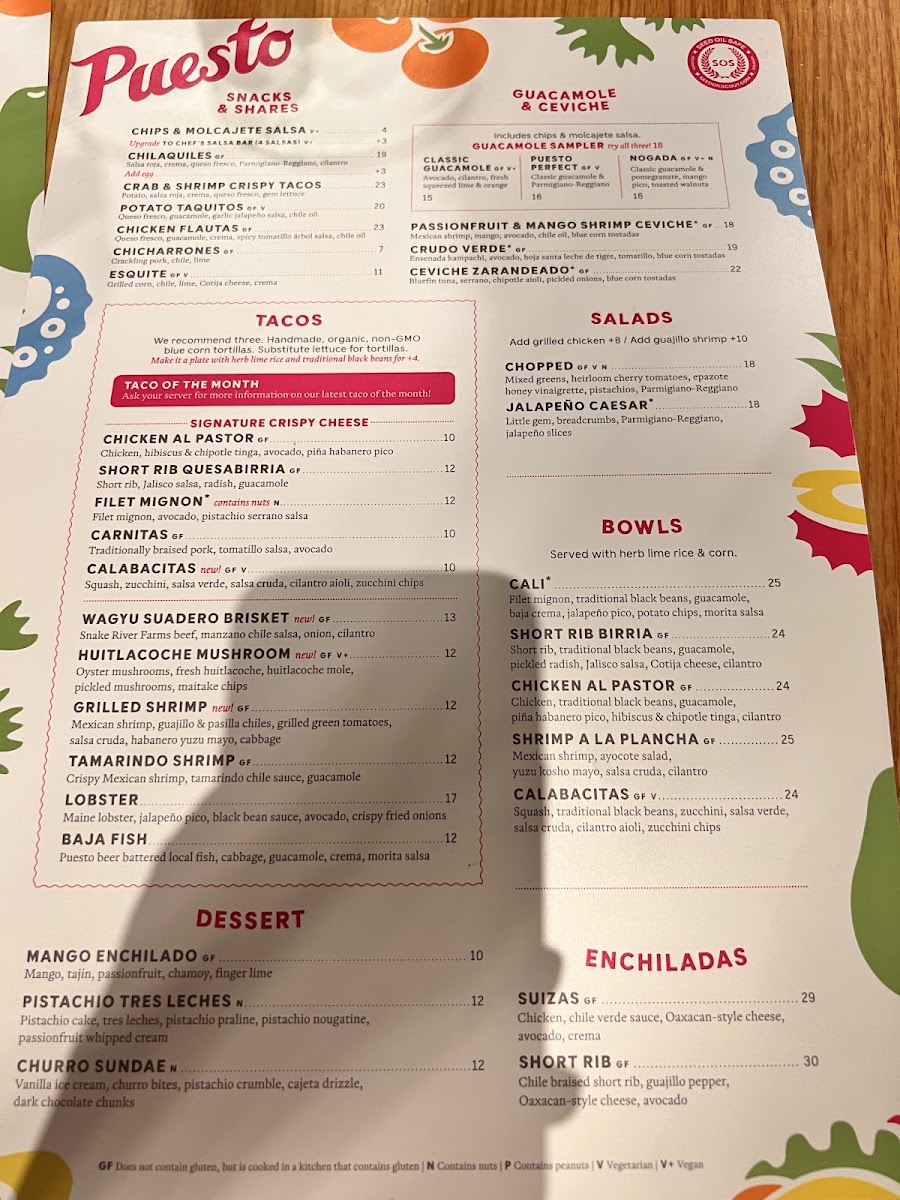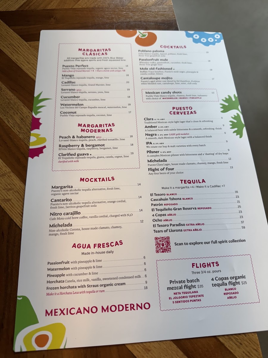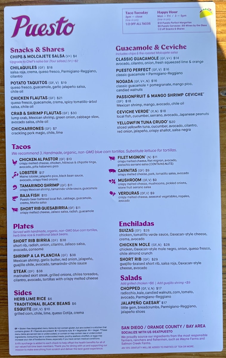 The menu at Puesto La Jolla offers a variety of traditional and modern Mexican dishes with a focus on tacos and shareable small plates. Guests can expect a selection of street tacos featuring meats such as birria, carnitas, al pastor, and seafood options like tamarindo shrimp. In addition to tacos, the menu includes catering options such as rice, black beans, guacamole, and esquite, providing complete meal additions for larger groups.